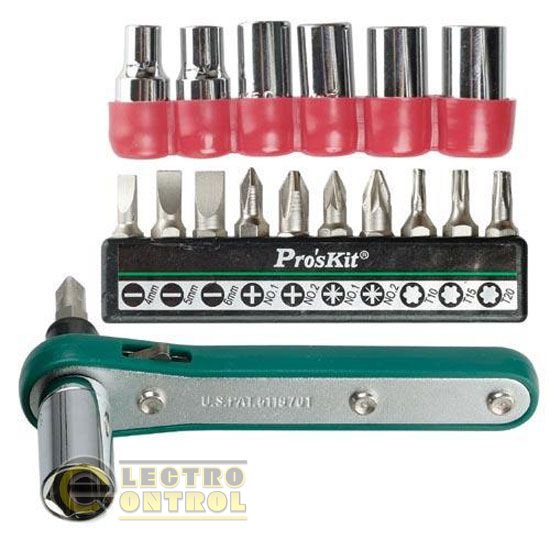 В набор Pro'sKit 1PK-201 входит реверсивная трещотка и 17 сменных бит и торцовых головок в обоймах для основных видов шлицев. Биты из высокопрочной хромванадиевой стали. Поставляется в блистерной упаковке.