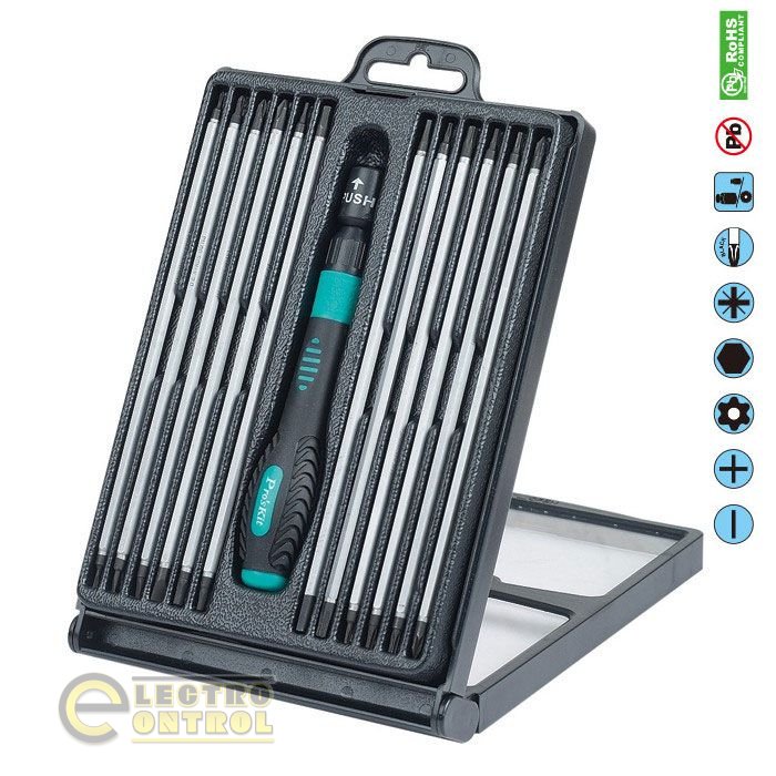 В набор Pro'sKit SD-9824 входит реверсивная отвертка-держатель с храповым механизмом и 12 прецизионных двусторонних сменных бит для разных видов шлицев из хромванадиевой стали. Нескользящая эргономичная рукоятка-держатель.
