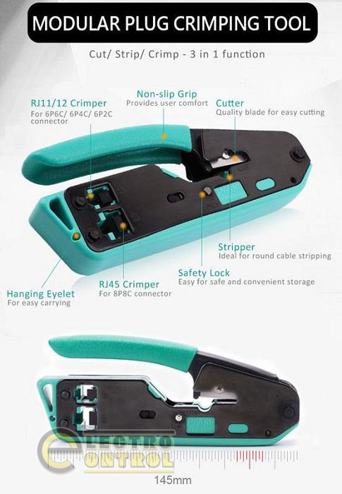 Компактный и удобный набор из кримпера и зачистки кабеля для телефонных и сетевых проводов на 6p и 8p в удобном жестком кейсе.