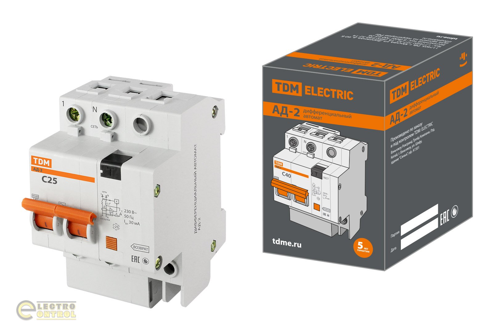 - Диф.автомат АД-2 2Р 25А 30мА TDM-