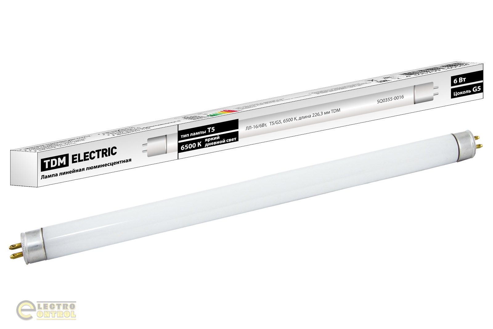 - Лампа люминесцентная линейная двухцокольная ЛЛ-16/6 Вт, T5/G5, 6500 К, длина 226,3мм TDM-