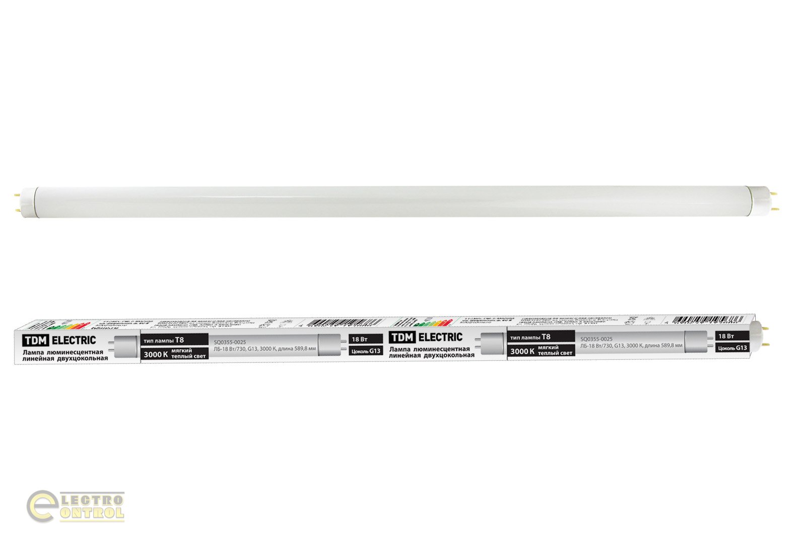 - Лампа люминесцентная линейная двухцокольная ЛЛ-18Вт/630, T8/G13, 3000 К TDM-