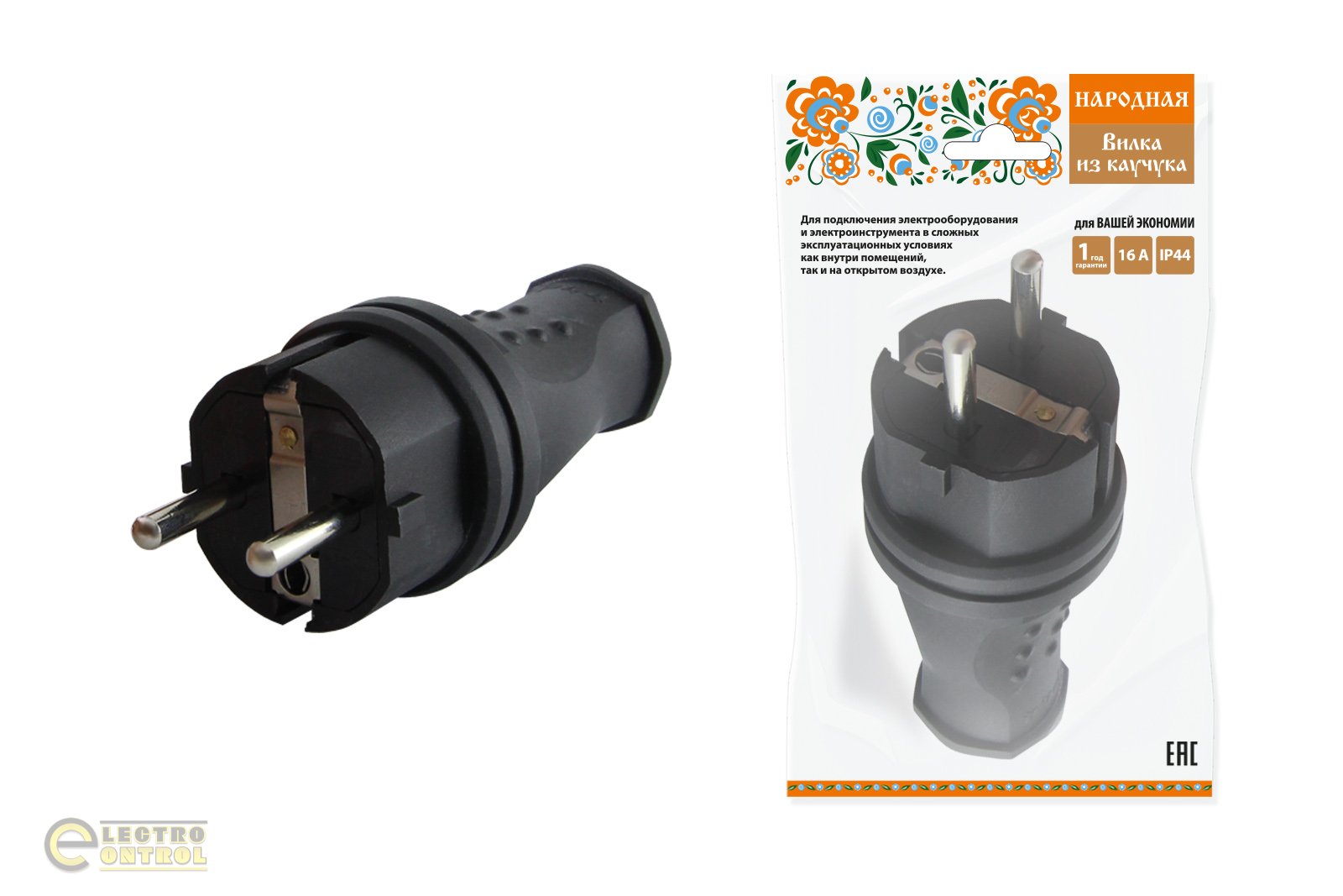 Вилка прямая каучук 2Р+РЕ 16А 250В IP44 серии ;Народная;