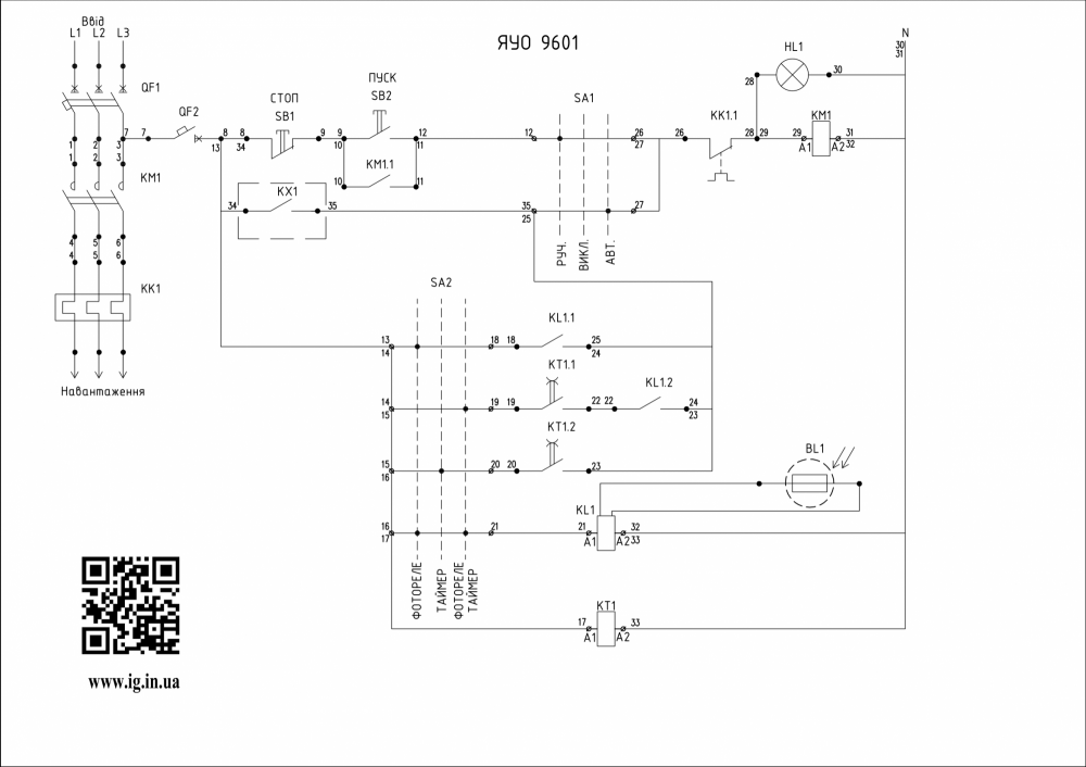 Щит ЯУО-9601-3674 (3ф 40А) работает с таймером времени и сумеречным реле, в автоматическом режиме сработка сигнала происходит в заданный промежуток времени от включения фотоэлемента. Данный щит так же обеспечивает работу схемы в следующих режимах (переключатель SA1):