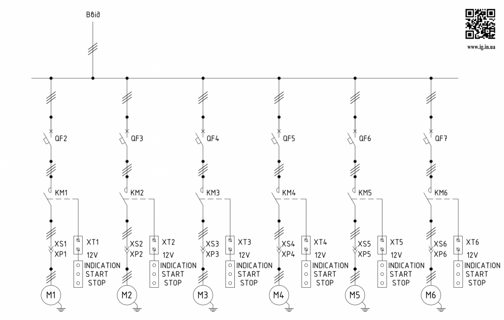 Ящик управления электродвигателями Я5000-6 предназначен для управления шестью трехфазными асинхронными нереверсивными электродвигателями с короткозамкнутым ротором. Так же в зависимости от комплектации данного устройства (Я5000) можно защищать двигатель от токов короткого замыкания и тепловых перегрузок (с помощью автомата защиты электродвигателя) и уменьшать значения пусковых токов на катушках двигателя, вести контроль параметров работы двигателя с помощью различных измерительных приборов, что обеспечит защиту от аварийных ситуаций. В данном случаи изделие просчитано на автомате защите электродвигателя и исполнительного механизма в виде электромагнитного контактора.