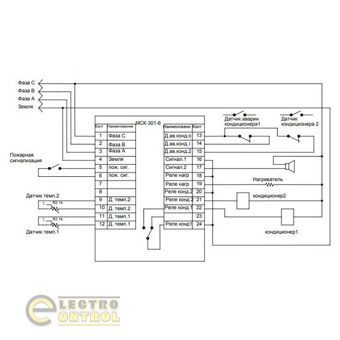 - контролирует исправность и управляет работой двух независимых кондиционеров;