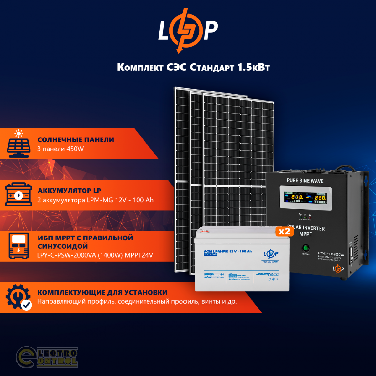 - ИБП LogicPower LPY-C-PSW-2000VA (1400W) MPPT24V – 1 шт.
