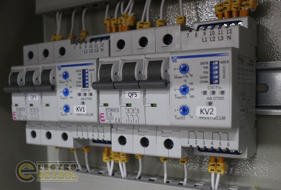 Реле контроля фаз (РКФ) (KV1, 2), перекоса и последовательности фаз отслеживает наличие напряжения на каждой из фаз, правильность их переключения, контролирует параметры на основном вводе. При пропадании напряжения на основном вводе, а так же при выходе параметров сети основного ввода из установленных пределов, РКФ подает сигнал на размыкания контакта (КМ1) контактора основного ввода (КМ1) в схеме управления резервным вводом, последовательно замыкается контакт (КМ2) на включения контактора (КМ2) резервного ввода. Переключения между вводами выполняется с задержкой по времени. Как только на основном вводе появляется напряжения, или параметры основной сети стабилизировались, происходит автоматическое переключения с резервного ввода на основной.