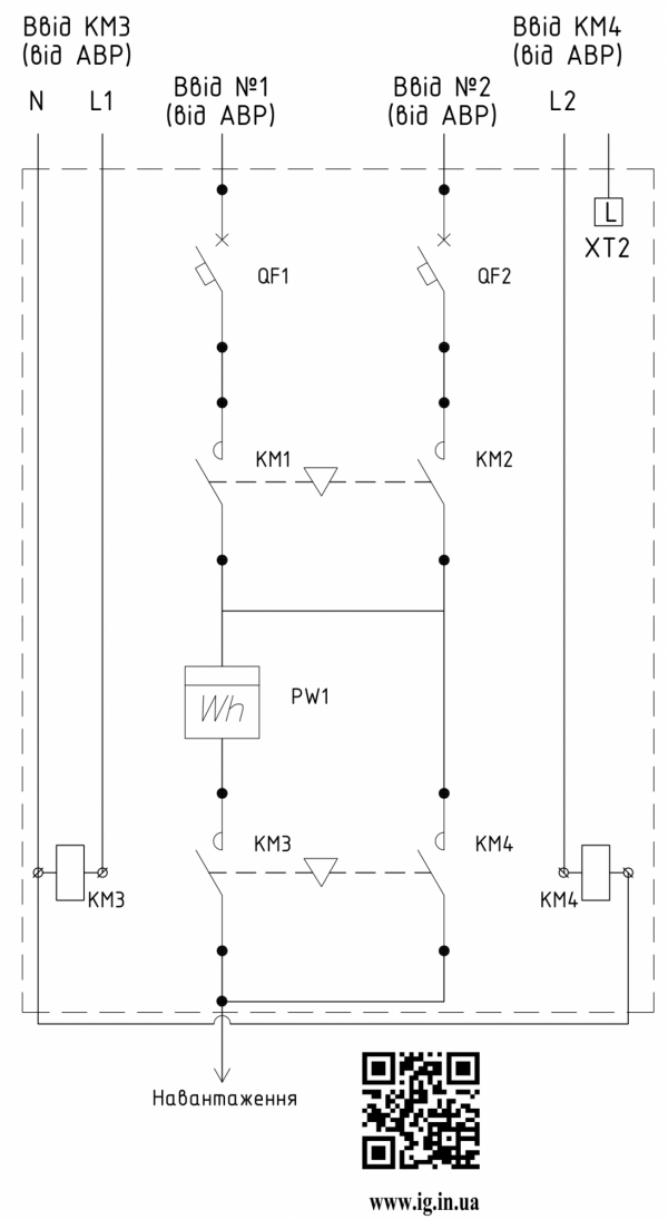 Щит автоматического ввода резерва АВРту-200-32А обеспечивает автоматический ввод резерва с возможностю ведения технического учета по вводу "Ввод 1". Силовые контакторы КМ1, КМ2, КМ3 и КМ4 обеспечивают надежную коммутацию электроэнергии и оснащены электрической и механической блокировкой, для обеспечения безаварийной работы установки. Данная схема работает по приоритету одного из вводов "Ввод 1" (переключение на рабочую линию "Ввод 1" происходит независимо от наличия электропитания на резервной линии), так же по данному вводу ведется учет потребляемой потребителем электроэнергии.