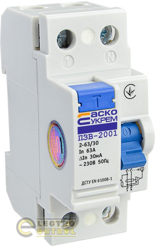 Пристрій захисного відключення УКРЕМ ПЗВ-2001 2р/63А/30мА АСКО