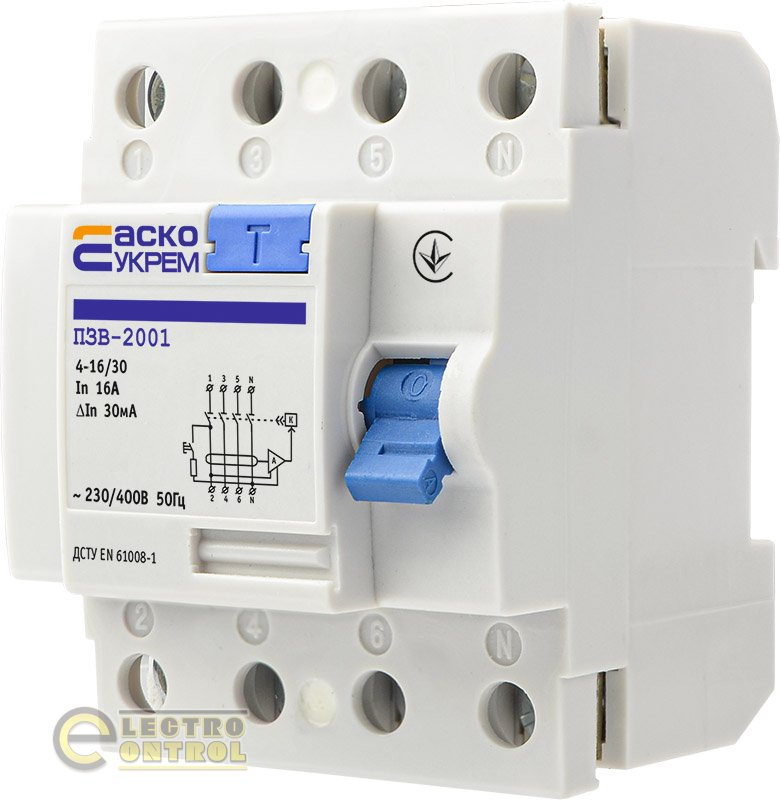 Пристрій захисного відключення УКРЕМ ПЗВ-2001 4р/16А/30мА АСКО