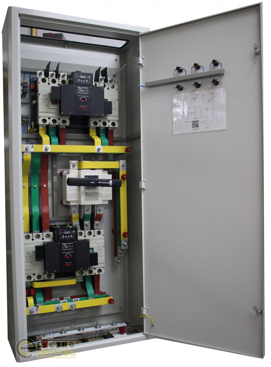 Особенности конструкции щита автоматического ввода резерва с мотор-приводом АВР-400. Устройство автоматического ввода резерва включает в себя три основных элемента: автоматический выключатель с мотор-приводом, контроллер, переключатель. Переключение между вводами происходит с помощью автоматических выключателей, которые переключаются мотор-приводом. Мотор привод, в свою очередь, управляется контроллером, который находится в корпусе мотор-привода или отдельно стоящий, зависит от конструктивного решения завода изготовителя