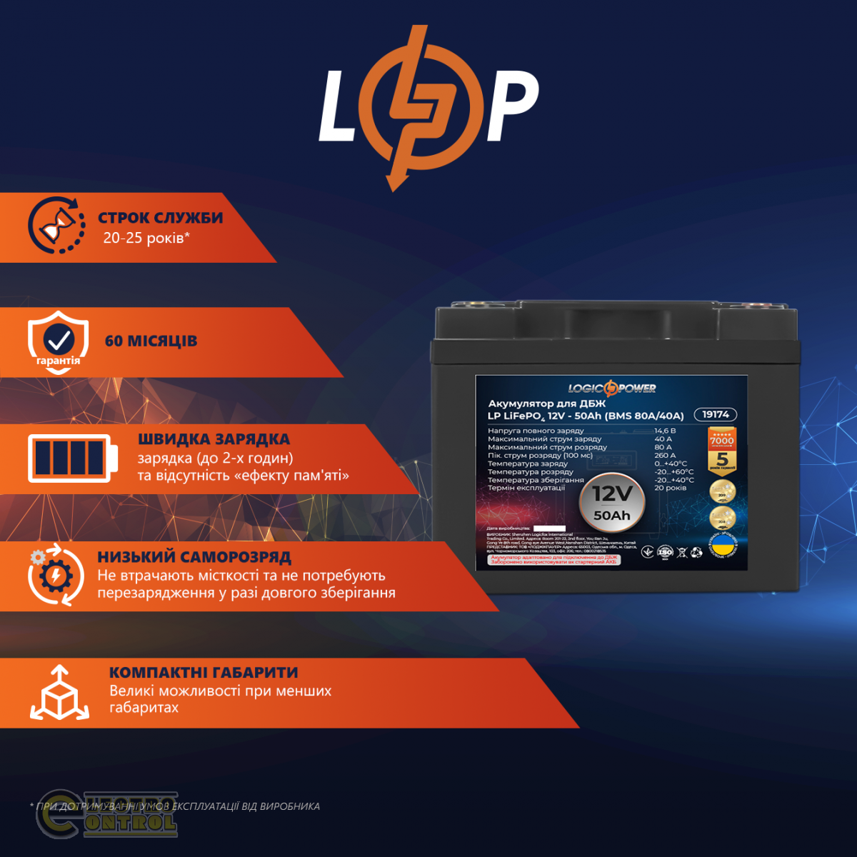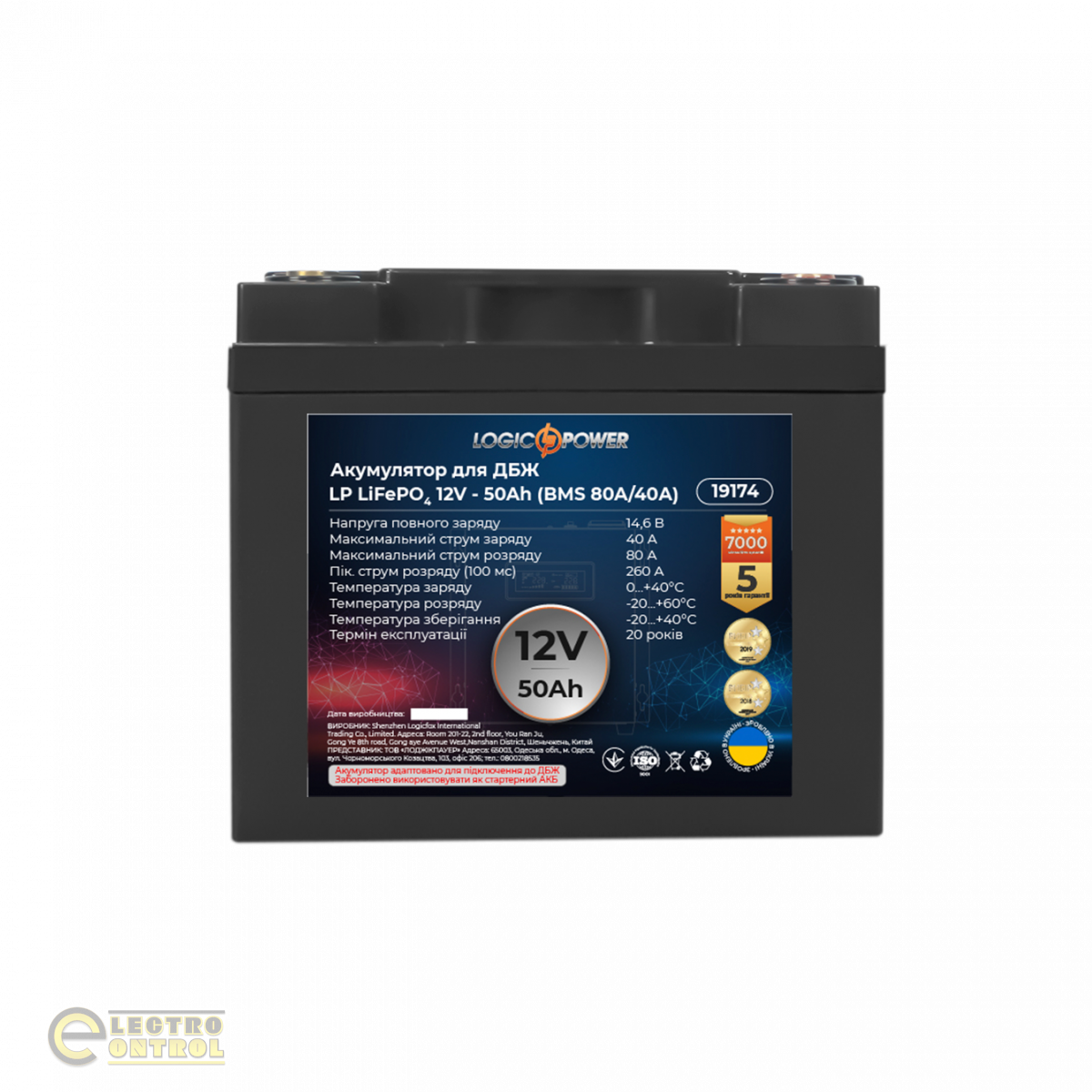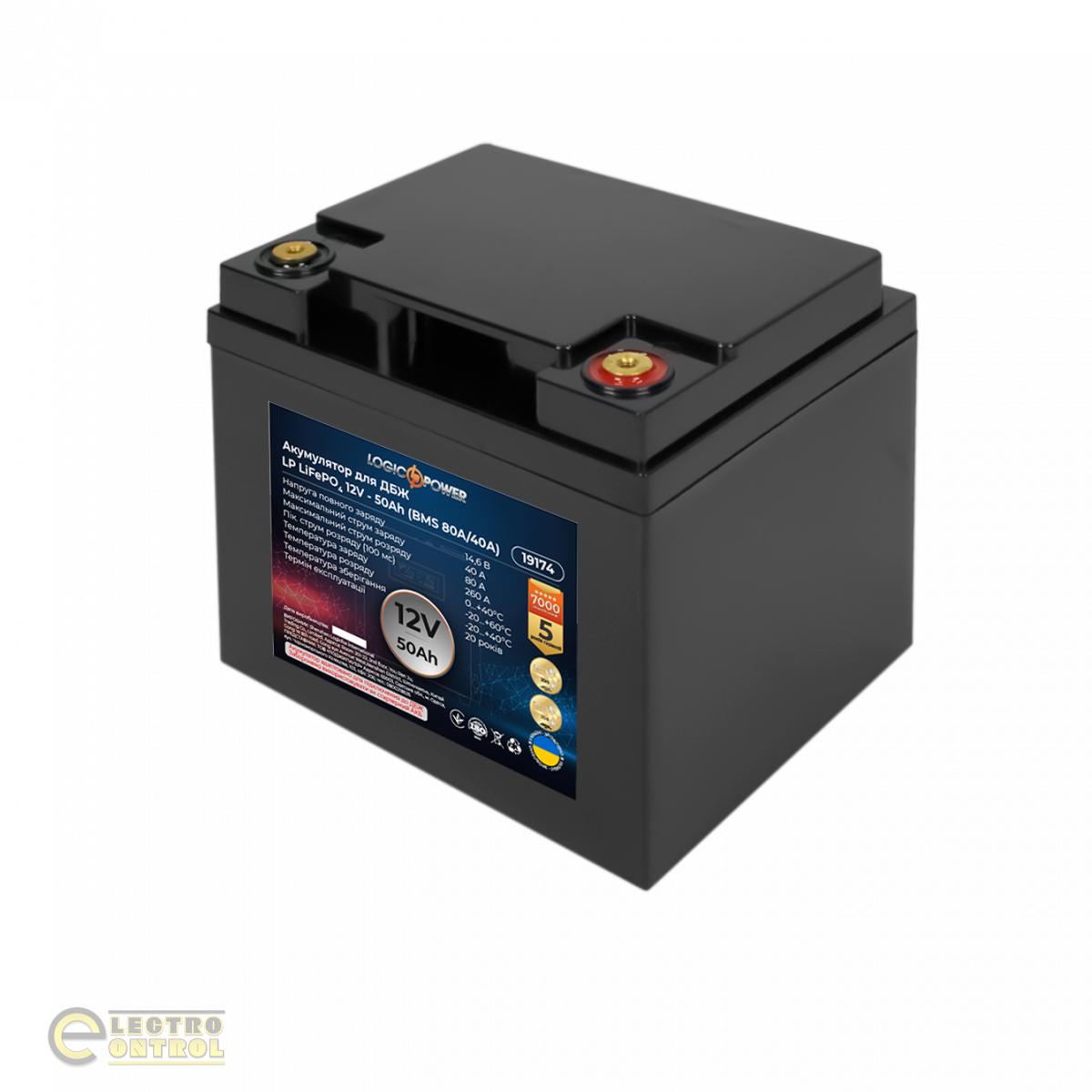 - Аккумулятор LP LiFePO4 12V (12,8V) - 50 Ah (640Wh) (BMS 80A/40A) пластик для ИБП-