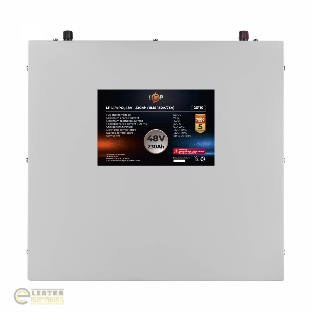 Литий-железо-фосфатный аккумулятор LP LiFePO4 48V - 230 Ah (BMS 150A/75A) металл. Внешняя установка, обладает высокой плотностью энергии, отсутствием вредных испарений и служит надежным и мощным источником электрической энергии. Отличается большим сроком службы и имеет до 7000 рабочих циклов. Мы рекомендуем их для использования, где важен высокий срок службы, высокая емкость и надежность. Срок службы до 15 лет.