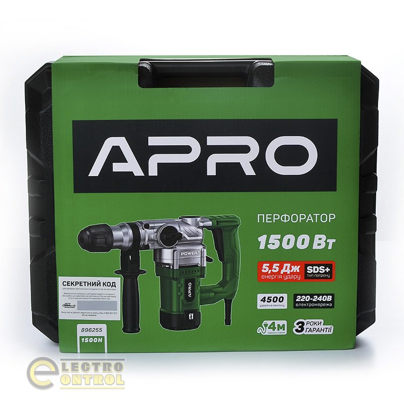 Данный перфоратор с быстрозажимным потроном АПРО 896255 обладает мощью удара до 5,5 Дж и оснащен патроном SDS +. Инструмент может достигать 4500 ударов за минуту, при условии работы от электросети 220-240 V. имеет максимальную мощность в 1500 Вт.