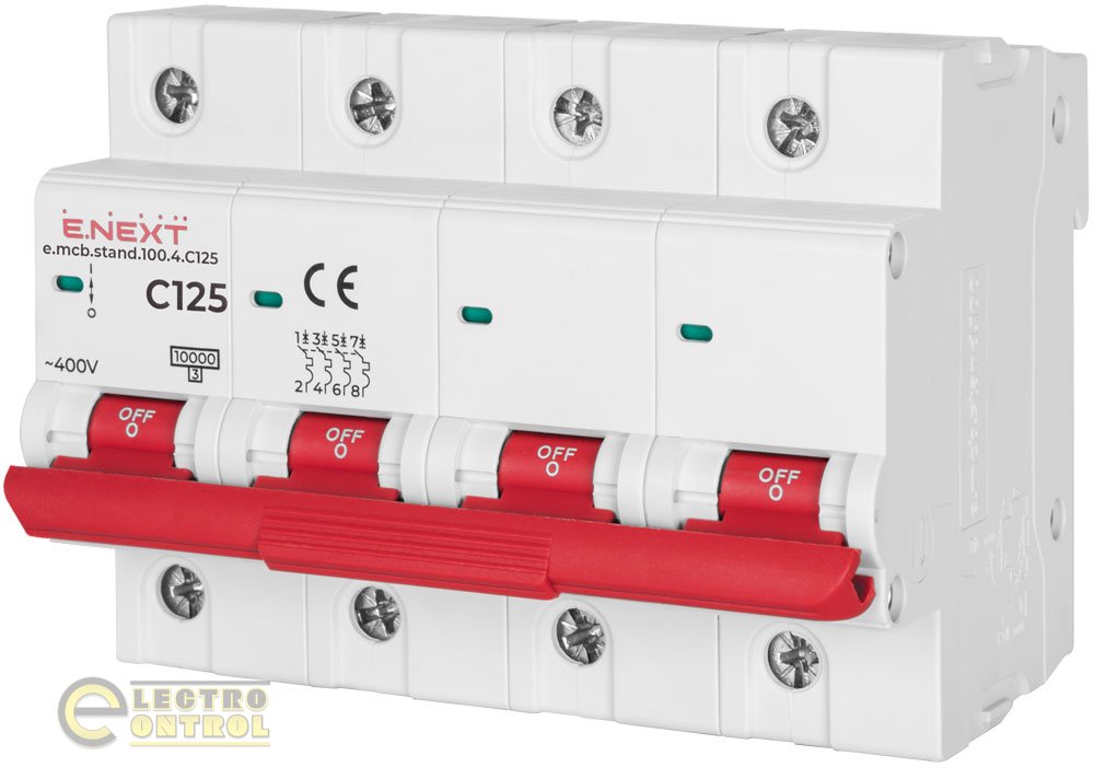 Для промышленных и бытовых применений могут быть использованы модульные автоматические выключатели Enext. Они могут защищать цепи переменного тока напряжением от перегрузки и коротких замыканий (токов короткого действия), также имеют возможность оперативного включения/выключения их на объектах любой площади. Выключатель Enext серий - e.mcb.stand.100 спроектирован для работы с номинальными токами до 10кА, категория срабатывания: C, число полюсов: черирехполюсный 4р артикул: s002219, отключающая способность: 10кА