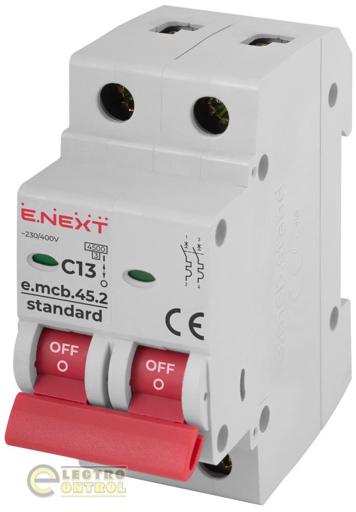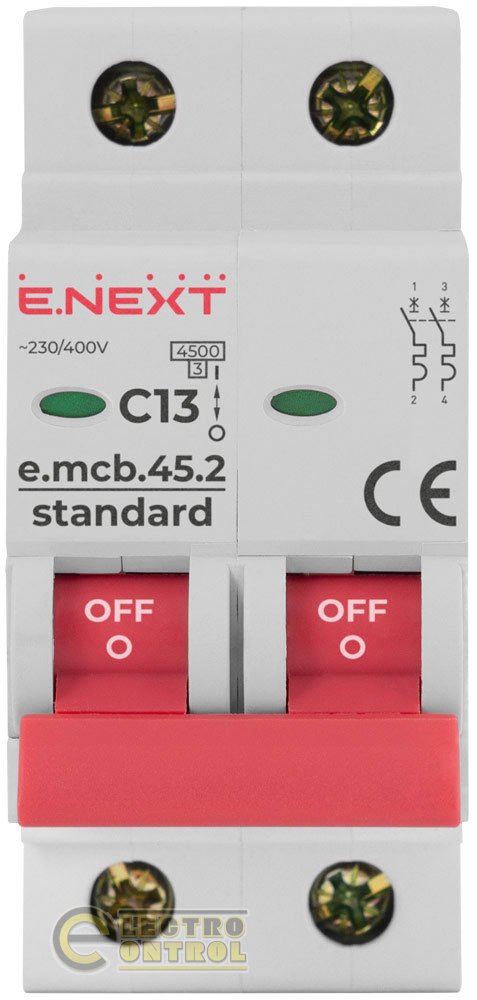 Для промышленных и бытовых применений могут быть использованы модульные автоматические выключатели Enext. Они могут защищать цепи переменного тока напряжением от перегрузки и коротких замыканий (токов короткого действия), также имеют возможность оперативного включения/выключения их на объектах любой площади. Выключатель Enext серий - e.mcb.stand.45 спроектирован для работы с номинальными токами до 4.5 кА, категория срабатывания: C, число полюсов: двухполюсний 2р артикул: s002058, отключающая способность: 4.5 кА