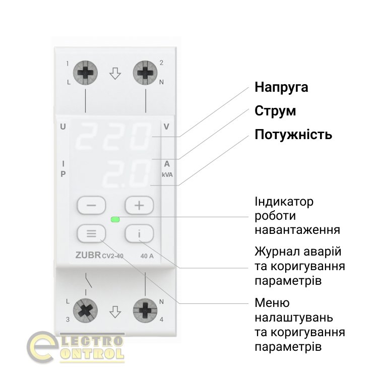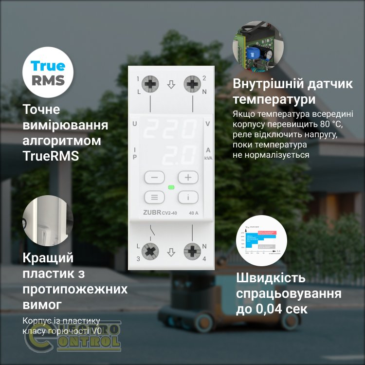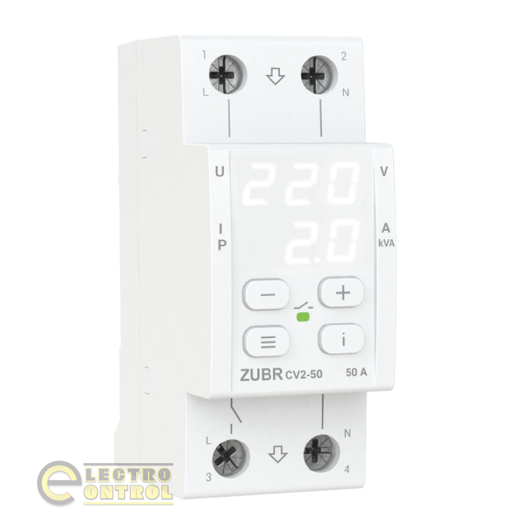 ZUBR CV2 защищает оборудование от высокого и низкого напряжения, обрыва нуля, а также ограничивает потребление тока или мощности. При отклонениях напряжения ZUBR отключит нагрузку, а при превышении тока или мощности нагрузка отключится через заданное время задержки.