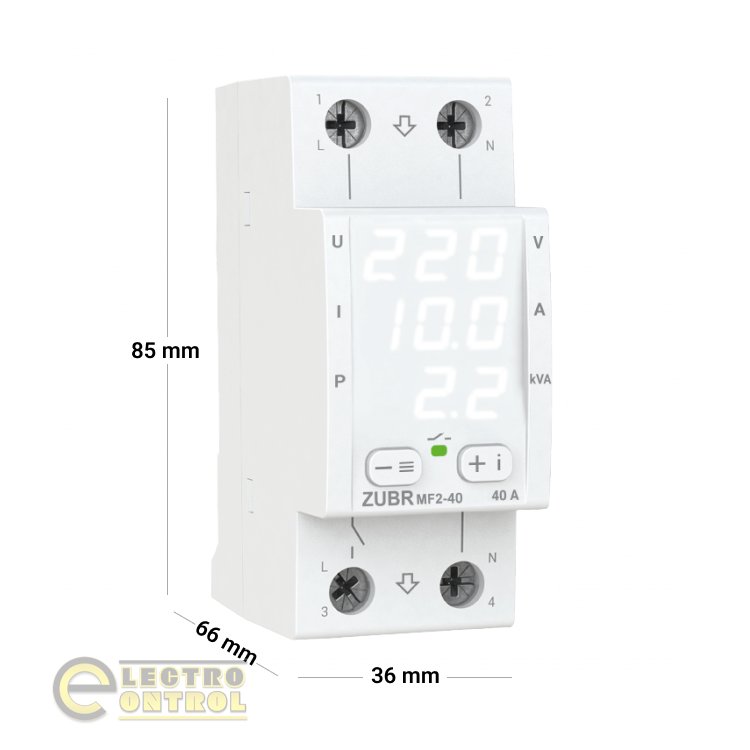 ZUBR MF2 защищает оборудование от высокого и низкого напряжения, обрыва нуля, а также ограничивает потребление тока или мощности. При отклонениях напряжения ZUBR отключит нагрузку, а при превышении тока или мощности нагрузка отключится через заданное время задержки.