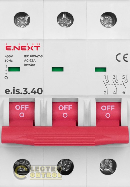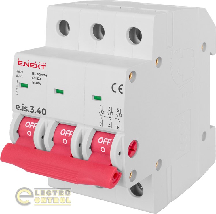 Выключатель нагрузки на DIN-рейку Enext e.is.3.40 3р 40А предназначен для переключения электрических цепей защищенных от коротких цепей и токов перегрузки.