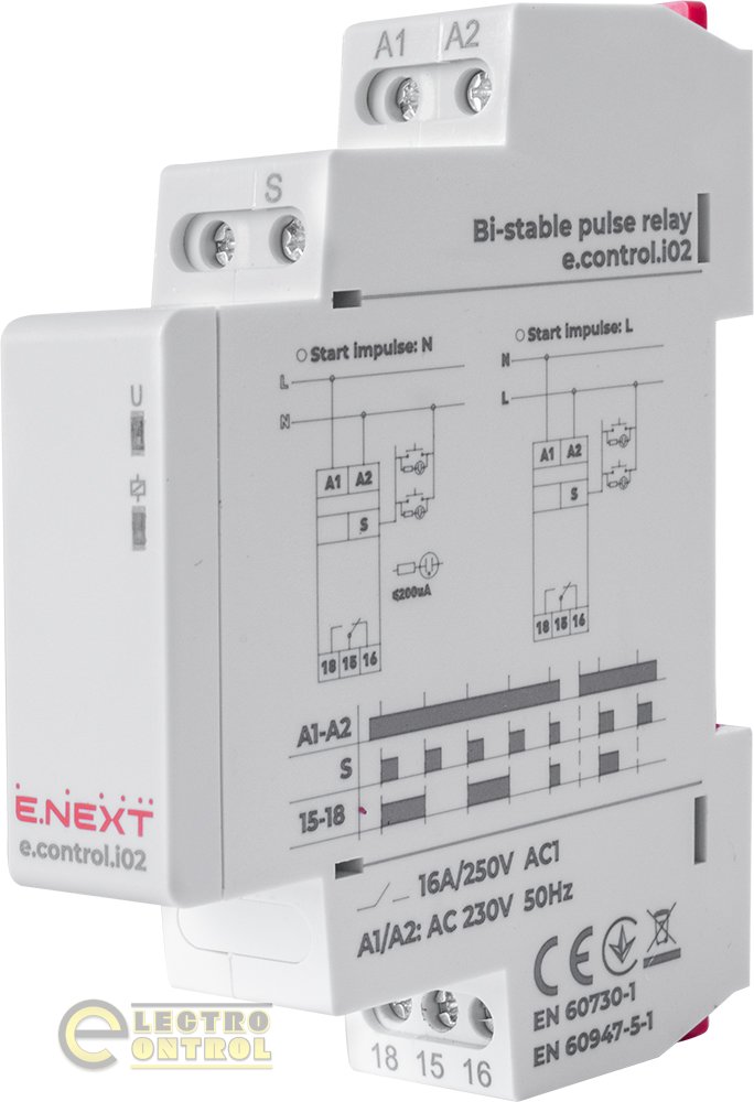 Реле импульсное e.control.i02, 16A, 230V предназначено для управления двухпроводной сетью осветительным и другим электротехническим оборудованием из нескольких мест с помощью параллельно соединенных кнопочных выключателей.