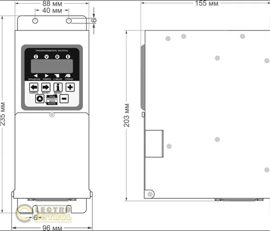- Наличие съемной, брызгозащищенной, передней панели с регулируемой по яркости светодиодной индикацией позволит выполнить монтаж преобразователя внутри силового шкафа с последующим дистанционным вынесением панели преобразователя на дверцу шкафа или пульт оператора с различными эксплуатационными условиями.