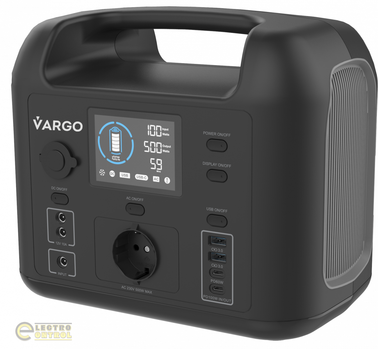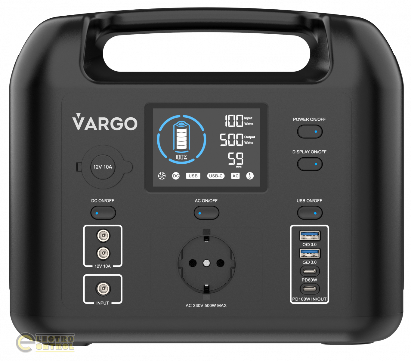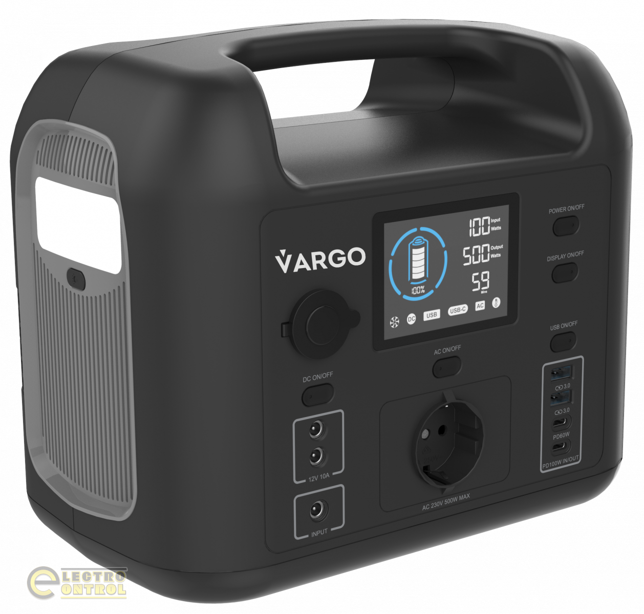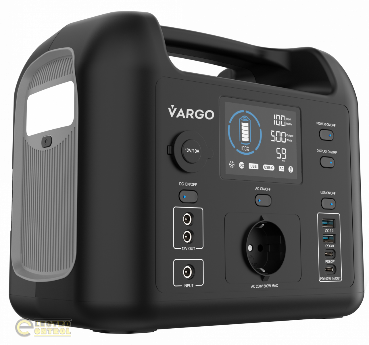 Портативная зарядная станция VARGO VRG 7834 может использоваться для резервного питания электроприборов мощностью до 500 Вт и зарядки различных гаджетов. Емкость аккумуляторов составляет 518 Втч. Устройство оснащено двумя розетками на 230 Вольт, двумя разъемами постоянного тока, автомобильным прикуривателем и портами USB-A и USB-C. На панели управления находится цифровой дисплей. Возможна зарядка от солнечной батареи. Есть защита от перенапряжения, перегрузки, короткого замыкания и перегрева. Есть светодиодный фонарик.