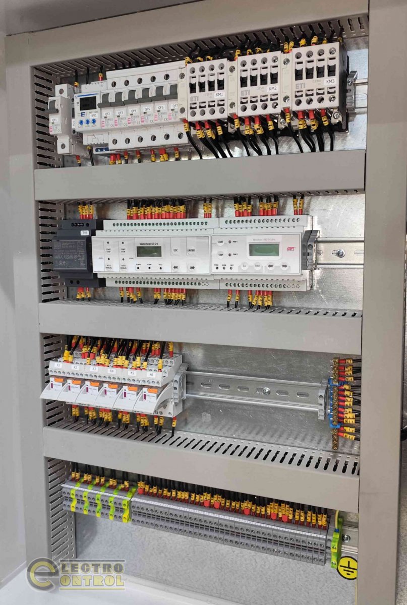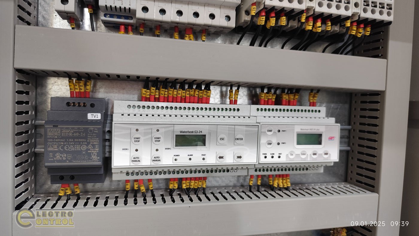 ⇒ Программируемые логические контроллеры и дополнительные модули расширения к ним. Производитель выбирается согласно пожеланиям заказчика. В щите представленного на фото был использования ПЛК Waterheat-S3-24 та Waterheat-UM2-24 plus производителя Raut Avtomatic.