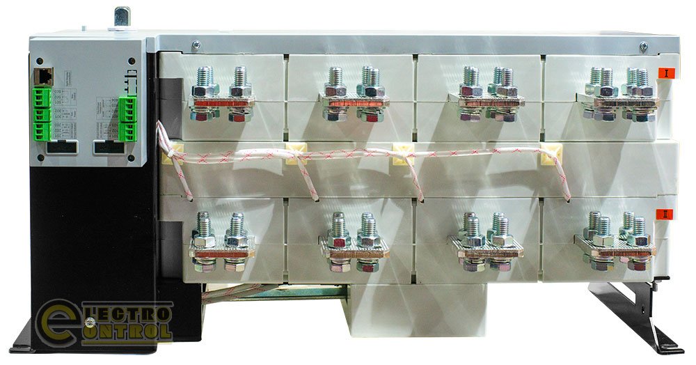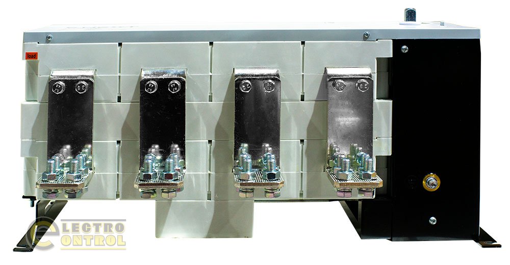 - четырехполюсной конструкции с моторизованным переключателем нагрузки с использованием нейтрального провода (N), что обеспечивает стабильность и безопасность в работе, позволяя эффективно выбирать между линиями питания.