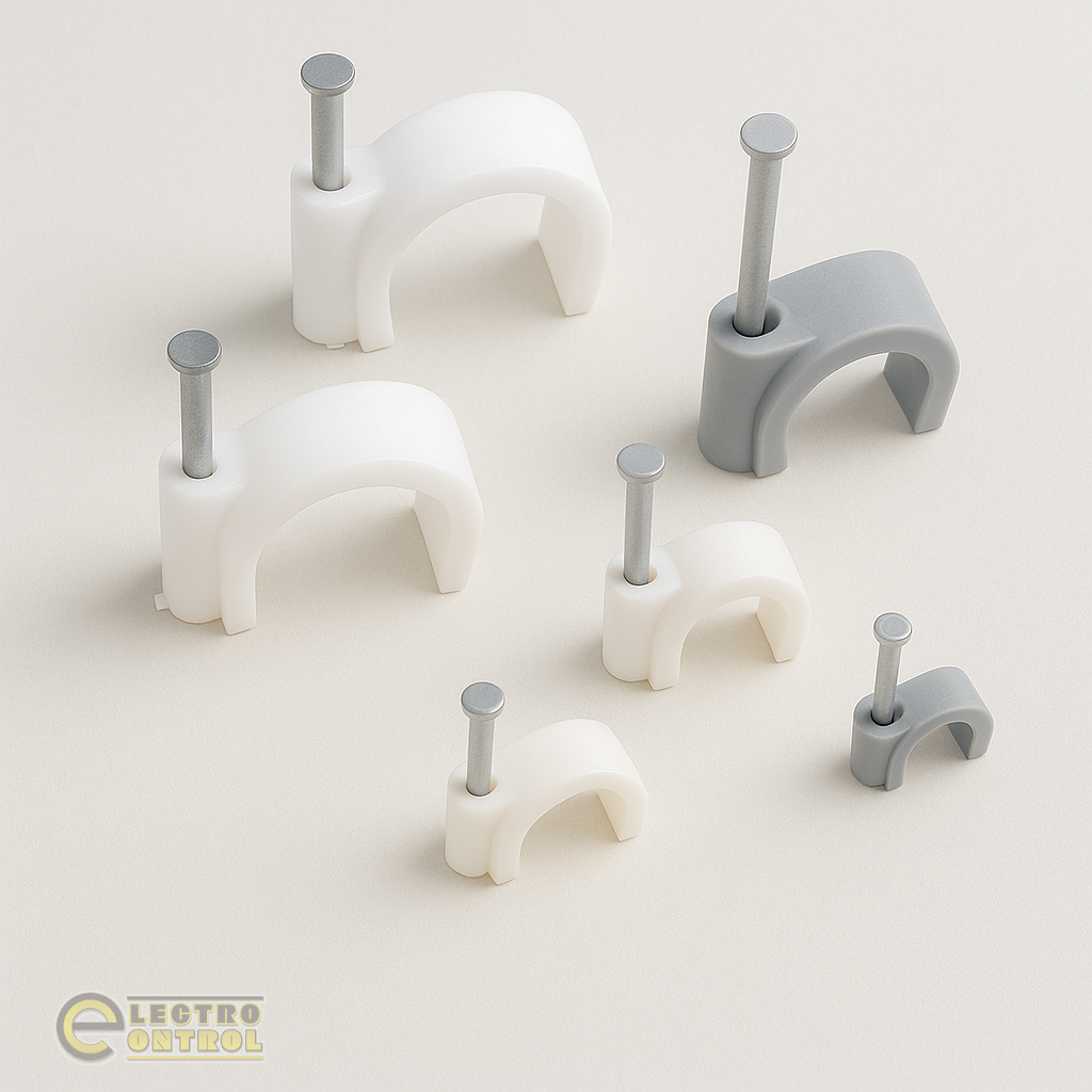 - Круглые скобы с гвоздём — оптимальны для круглых кабелей диаметром до 20 мм. Обеспечивают надёжное прилегание к поверхности и аккуратный внешний вид.