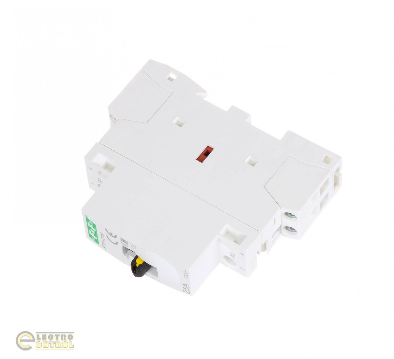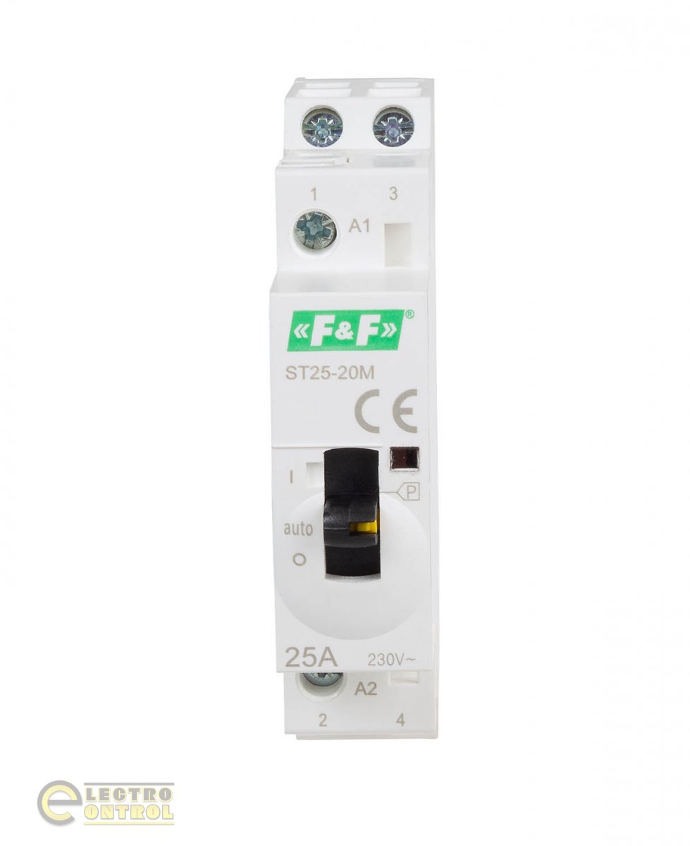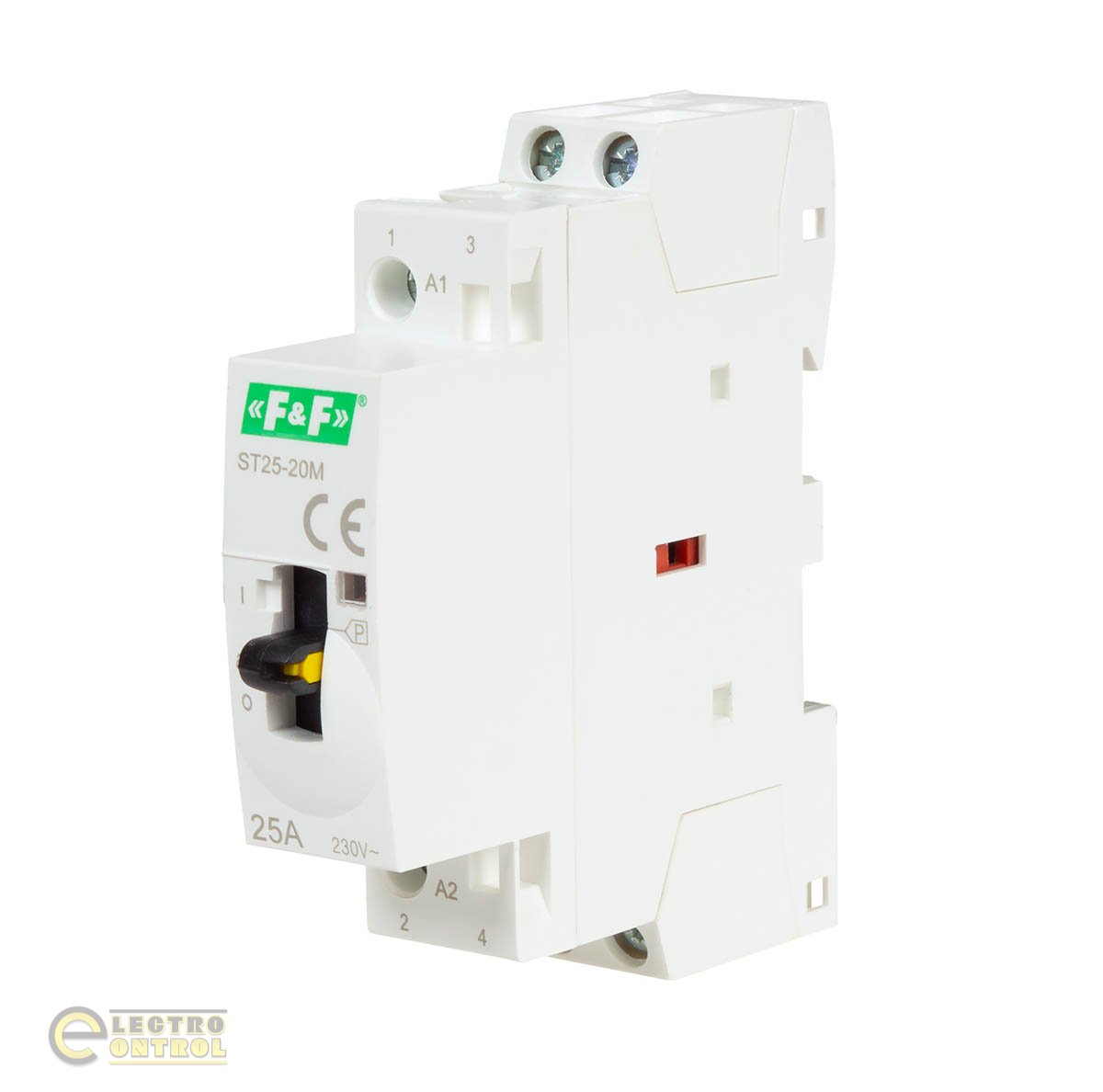 Контактор модульный с переключателем для ручного управления Ток 25 А. Напряжение 250 В переменного тока. ST25-20-М Электромагнитный контактор с механическим переключателем Модульный электромагнитный контактор для монтажа на DIN-рейку в распределительном щите. Переключатель на передней панели позволяет вручную управлять контактами контактора (независимо от состояния катушки). Это позволяет подключать или отключать нагрузку вручную, например, во время монтажа/обслуживания. Принцип работы контактора ST25-20-МРабота контактора зависит от настройки переключателя режимов работы:Позиция «I» (верхняя позиция)Если катушка контактора обесточена, то контакты контактора замыкаются. После подключения питания контактора переключатель автоматически переключается в положение «AUTO» и с этого момента работает в автоматическом режиме. Чтобы зафиксировать контакты в замкнутом положении «I», независимо от питания контактора, переместите желтый рычаг блокировки влево в положение «I». Положение «AUTO» (среднее положение) Подача питания включает контактор и замыкает контакты. После отключения питания контактор отключается, а контакты размыкаются. Положение «O» (нижнее положение) Контакты контактора остаются размыкаными независимо от наличия напряжения питания.