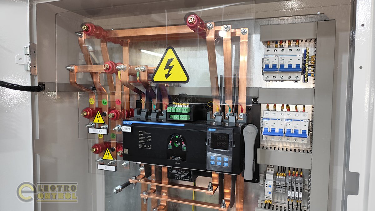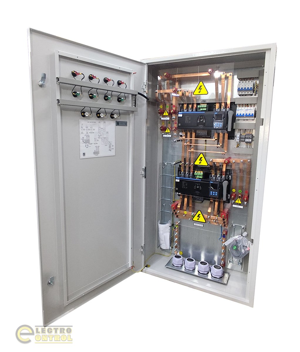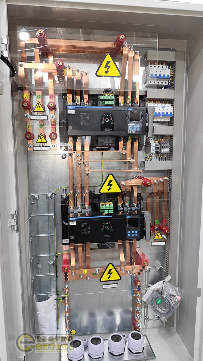 - Два литых устройства АВР: коммутация вводов осуществляется автоматическими выключателями с мотор-приводами, а управления обеспечивается контроллером АВР, который выполняет функции мониторинга параметров сети и управления переключением.