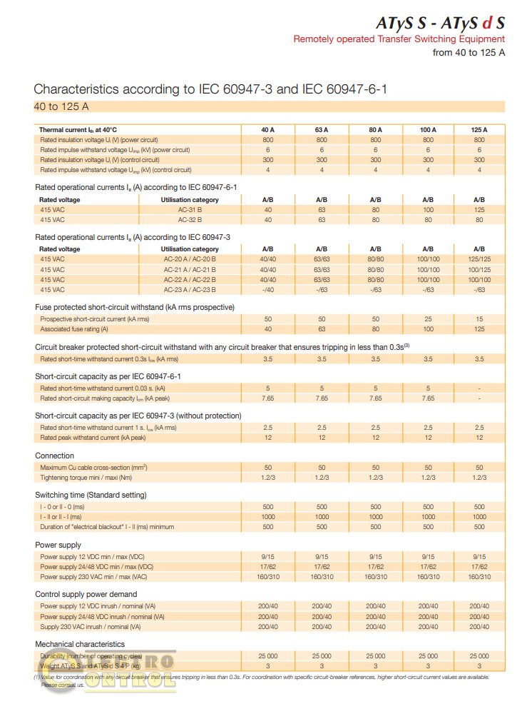 Socomec ATyS S — это серия компактных 4-полюсных переключателей с моторным приводом, предназначенных для дистанционного переключения источников питания в низковольтных цепях. Устройства обеспечивают переключение под нагрузкой по командам от внешнего контроллера АВР или автоматики, используя «сухие» контакты. Благодаря малым габаритам, серия идеально подходит для установки в распределительные щиты с ограниченным пространством (глубиной от 200 мм).