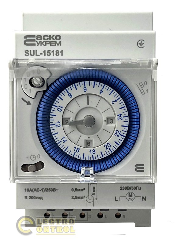 Таймер SUL-15181 от АСКО-УКРЕМ — это надежное устройство электромеханического типа, предназначенное для автоматического управления электрооборудованием по заданному суточному расписанию. Модель обеспечивает коммутацию нагрузок до 16 А в сетях 230 В и отличается наличием встроенного аккумулятора, что позволяет сохранять ход часов даже при отключении основного питания.