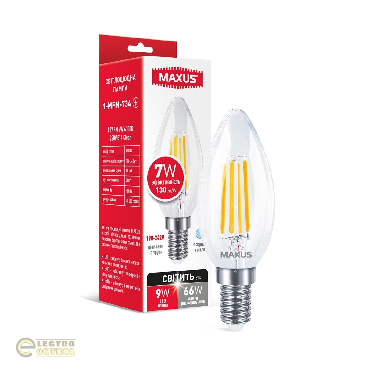 Лампа светодиодная MAXUS 1-MFM-734 C37 FM 7W 4100K 220V E14 Clear