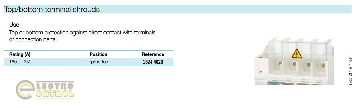 Комплект клеммных крышек для защиты от прямого прикосновения к силовым контактам. Предназначен для 3-х и 4-полюсных выключателей Sirco VM2 номиналом 160–250 А. Устанавливается сверху или снизу аппарата.