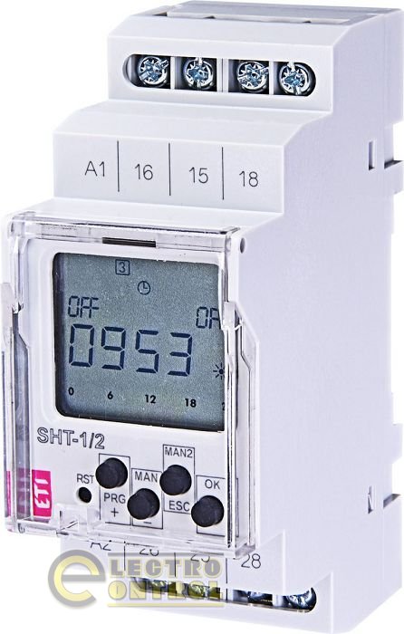 На сайте ecshop (Электроконтроль) Вы можете ознакомиться и купить программируемое цифровое реле SHT-1/2 230V AC (2x16A_AC1) 2470053 ETI . Програмируемые цифровые таймеры SHT-1, SHT-1/2, SHT-3, SHT-3/2 предназначены для дистанционного управления освещением и различными устройствами, с привязкой к реальному времени.