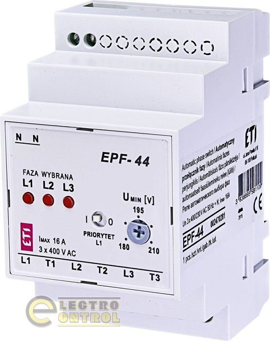 Реле автоматического выбора фаз используют с целью обеспечения бесперебойного питания однофазной нагрузки (оборудования) при понижении напряжения или обрыве одной или двух фаз трехфазной сети питания. Имеет способность выбора приоритетной фазы. Реле EPF-44 имеет независимые выходы, которые дают возможность подключения контакторов для увеличения тока нагрузки (устройств) свыше 16А (АС1).