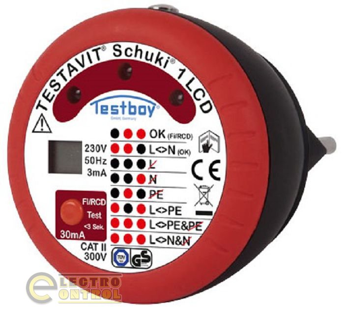 На сайте ecshop (Электроконтроль) Вы можете ознакомиться и купить розеточный тестер Testavit Schuki 1 LCD немецкого бренда Testboy. Прямое назначение прибора это проверка правильности подсоединения и определение работоспособности штепсельных розеток, кабельных барабанов, электрических кабелей, удлинителей, работающих под напряжением 230 В. Имеющимися тремя светодиодами можно быстро и точно выявить состояние подключения. Также коснувшись пальцем легко проверить присутствие в точке присоединения защитного кабеля недопустимо высокого напряжения касания. Если Testavit Schuki 1 LCD использовать вместе с нажимным кнопочным выключателем , можно способствовать срабатыванию предохранительного выключателя RCD, который действует при возникновении утечки тока 30 мА.