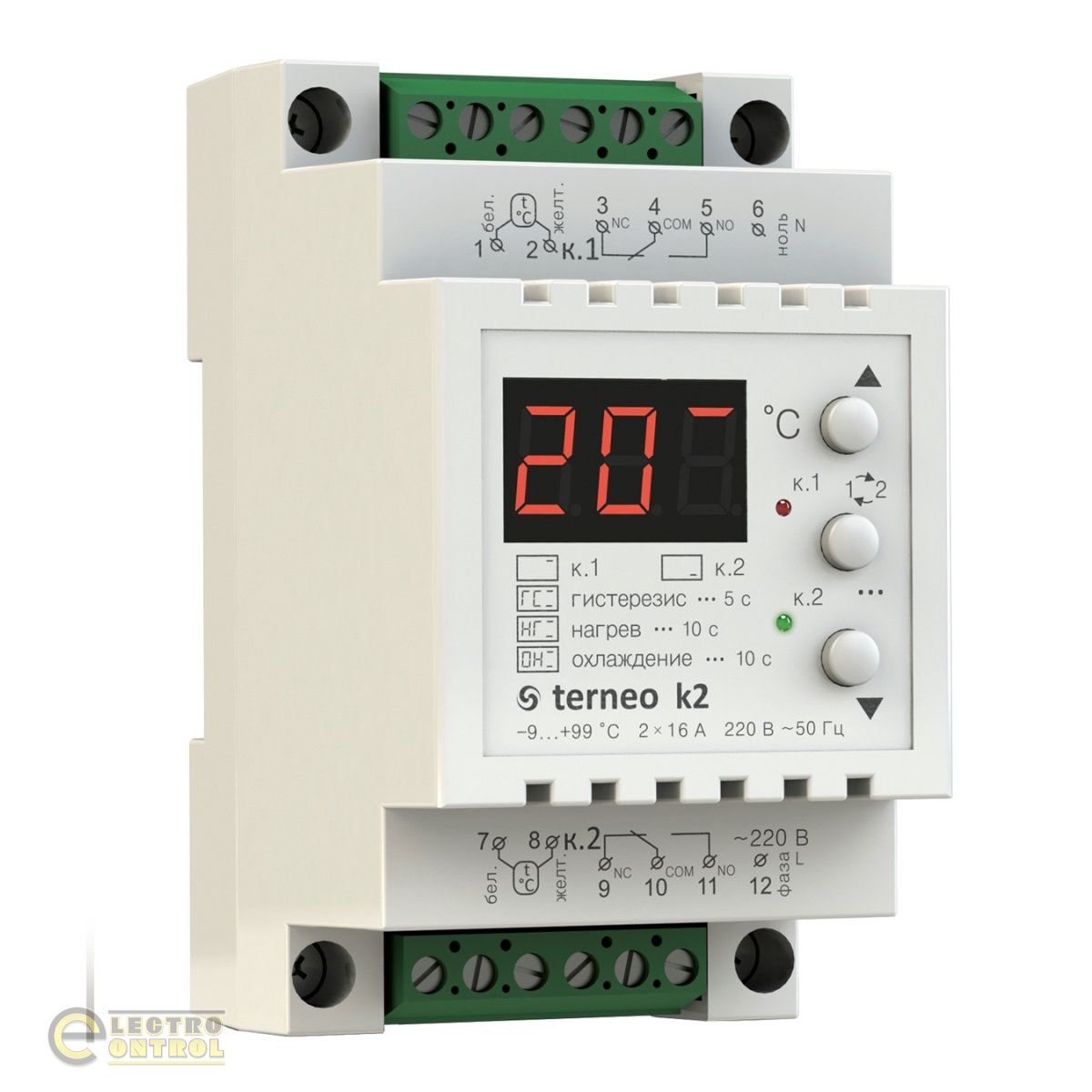 terneo k2 — двухканальный терморегулятор с настраиваемым режимом работы (нагрев / охлаждение). Можно отдельно управлять двумя зонами нагрева, или двумя зонами охлаждения, или одной зоной нагрева и одной зоной охлаждения.Если датчики обеих каналов разместить в одном месте и на один канал подключить нагреватель, а на другой охладитель, то температуру можно поддерживать в нужных пределах круглый год.−9...+99 °С