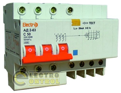Дифференциальный автоматический выключатель АД2-63 3 полюса+N 63А 30мА