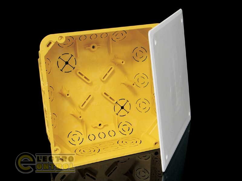 Коробка выполняет защиту от попадания воздуха, пыли, влаги IP20. Возможно большое количество вводов для установки кабелей и труб. Можно установить несущую рейку TS 35. Пазы в углах коробки дают возможность выровнить крышку. Для облегчения манипуляций с проводами можно удалить всю боковую стену коробки. Шипы для пометки центра сверления отверстий в гипсокартоне. Монтажные винты имеют трехшаговую резьбу для быстрого монтажа.