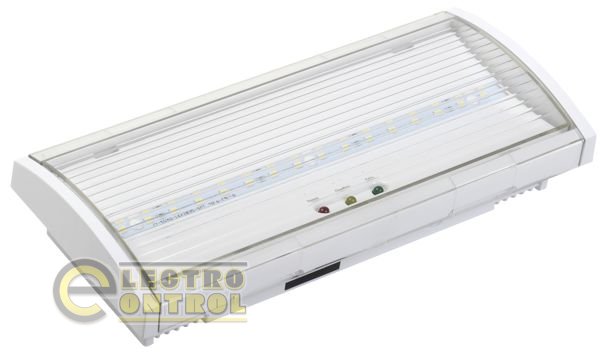Індикація: Зелений – процес зарядки акумулятора. Червоний – світильник підключений до мережі, акумулятор заряджений повністю. Жовтий - помилка. Вбудована функція - AUTO TEST (щорічний і щомісячний автоматичний запуск і перевірка працездатності світильника й акумулятора - при виникненні проблем загориться ЖОВТИЙ індикатор).