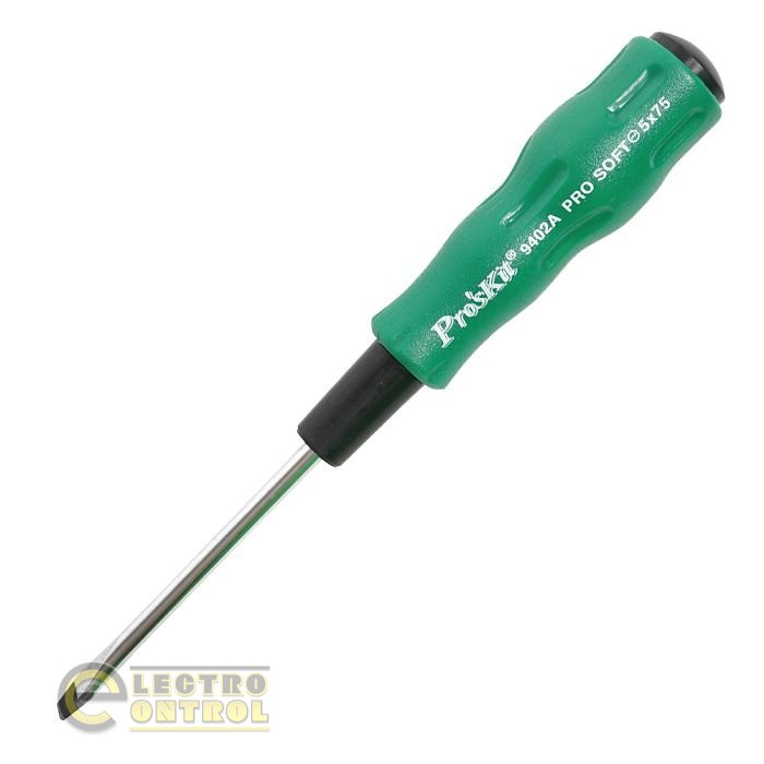 Отвертка ProsKit серии Pro-Soft. Жало изготовлено из кованой, отпущенной хромванадиевой стали, с отполированной поверхностью и кончиком жала, покрытым коррозинностойкой оксидной пленкой. Прочное, износостойкое соединение жала с рукояткой. С высокой степенью передачи крутящего момента. Нескользящая мягкая рукоятка - из полипропилена.