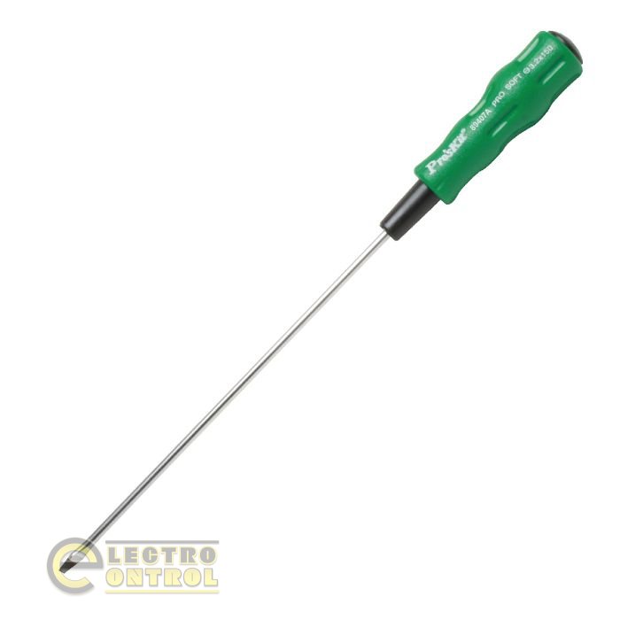 Отвертка ProsKit серии Pro-Soft. Жало изготовлено из кованой, отпущенной хромванадиевой стали, с отполированной поверхностью и кончиком жала, покрытым коррозинностойкой оксидной пленкой. Прочное, износостойкое соединение жала с рукояткой. С высокой степенью передачи крутящего момента. Нескользящая мягкая рукоятка - из полипропилена.