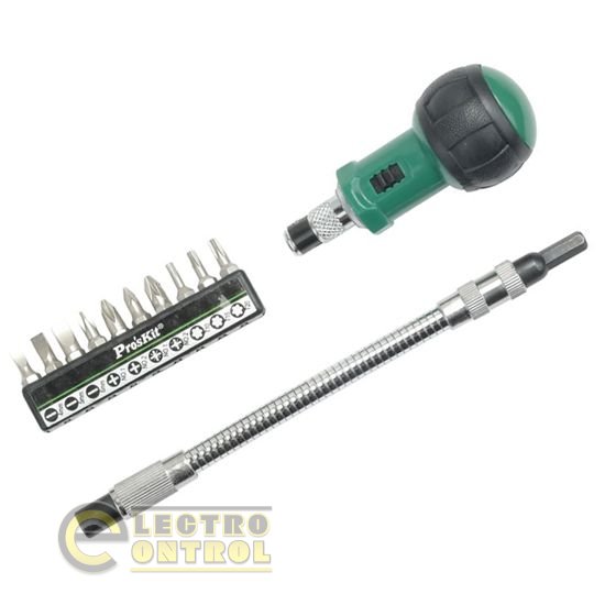 В набор Pro'sKit 1PK-201 входит реверсивная отвертка-трещотка, гибкий удлинитель и 10 сменных бит в обойме для основных видов шлицев. Биты из высокопрочной хромванадиевой стали. Поставляется в блистерной упаковке.