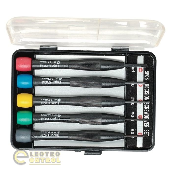 Набор ProsKit из 5 прецизионных крестовых подстроечных отверток с вращающимися разноцветными колпачками. Жала изготовлены из прочной, высококачественной хромированной стали. Рабочие концы дополнительно подвергнуты пескоструйной обработке.Тонкие нескользящие рукоятки с насечкой для комфортной работы. Поставляются в компактной пластиковой коробке.