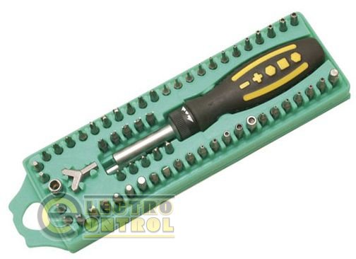 В набор Pro'sKit SD-205 входит 62 предмета: отвертка-трещотка, магнитный держатель бит 1/4", переходник, адаптер и 57 сменных бит для всех основных видов шлицев. Изготовлен из высокопрочной стали. Нескользящая эргономичная отвертка-держатель с храповым механизмом.