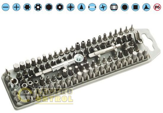 Набор из 100 предметов с держателем-трещоткой ProsKit. В составе набора: рукоятка-трещотка с храповым механизмом из нержавеющей стали, магнитный адаптер, ограничитель, удлиннитель, переходник, а также 96 различных бит, изготовленных из высококачественной хромванадиевой стали. Поставляется в футляре, удобном для хранения и переноски.