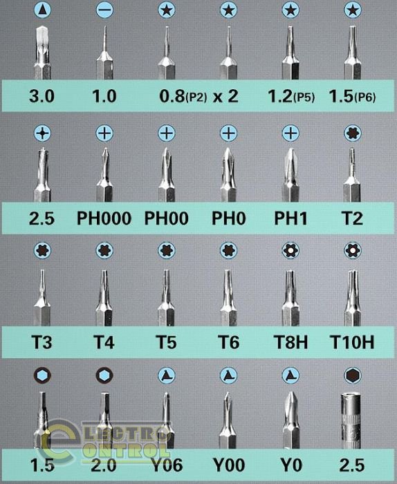Профессиональный набор различных инструментов для ремонта Apple iPhone 4, 4S, 5, 5C, 5S, 6, 6 Plus, 7, 8, X, Samsung, Huawei, Xiaomi, Oppo, Vivo, а также других смартфонов, планшетов и ноутбуков. В набор входят: биты - 24 штуки, битодержатель , присоска вакуумная, рычажки - 2 штуки, подъемная лопатка, пинцет, устройство для извлечения сим-карты, спуджер, вспомогательный инструмент для пайки. Поставляется в удобном и прочном кейсе с крышкой.